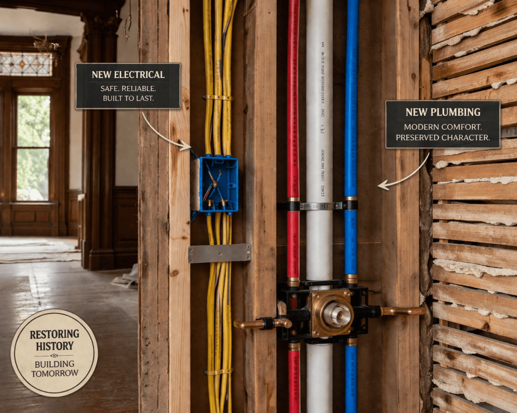Install electrical panels with adequate amperage, dedicated circuits for major appliances, and GFCI protection in wet areas. Replace old plumbing with modern materials that provide better flow, fewer leaks, and longer lifespan.