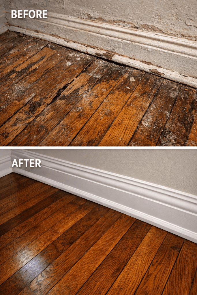 Original hardwood flooring often hides beneath carpet or damaged finish layers. Professional refinishing removes decades of wear while preserving the tight-grain old-growth wood unavailable in modern materials.