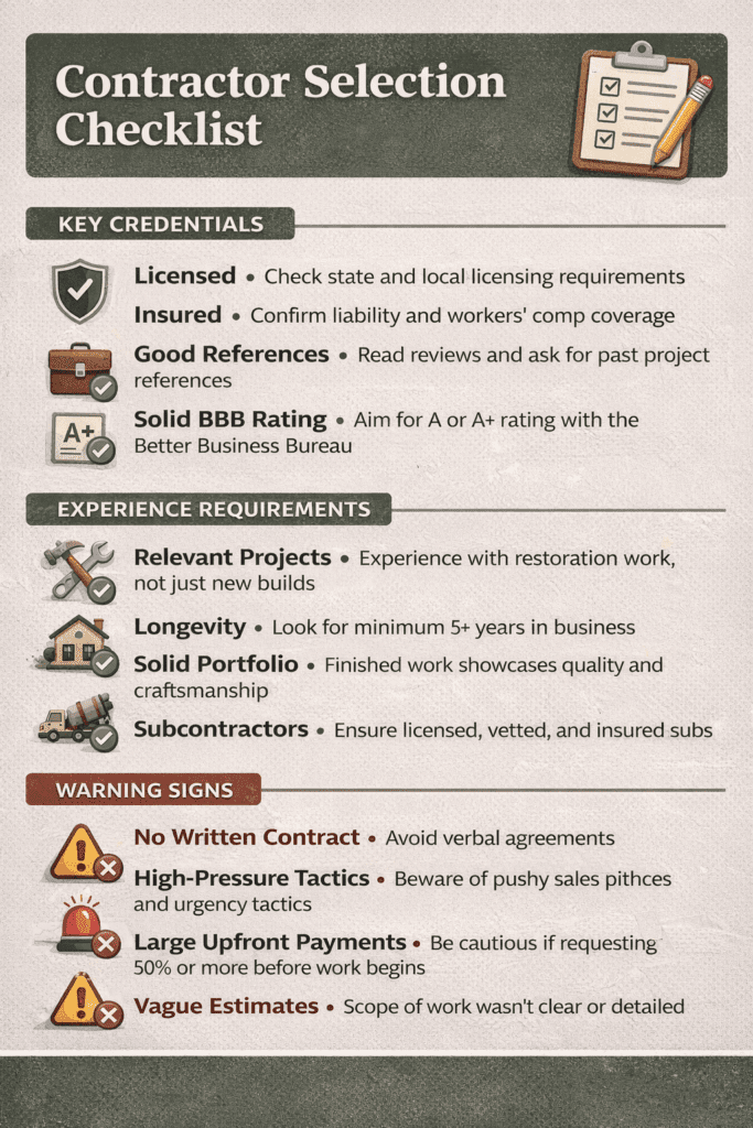 Verify licensing, insurance, and bonding appropriate for your project scope. Restoration work requires specialized knowledge beyond standard remodeling, so prioritize contractors with documented historic renovation experience.