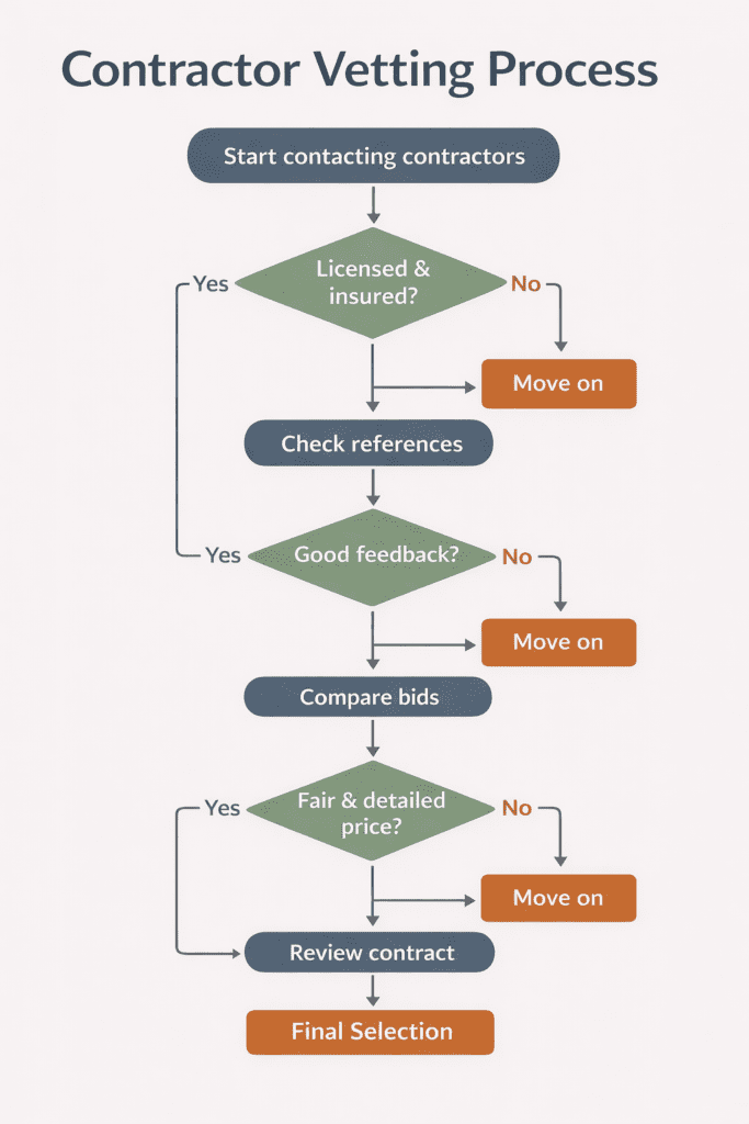 • Licensed contractors are mandatory – Verify active licenses, insurance coverage, and local bonding requirements before signing any agreements