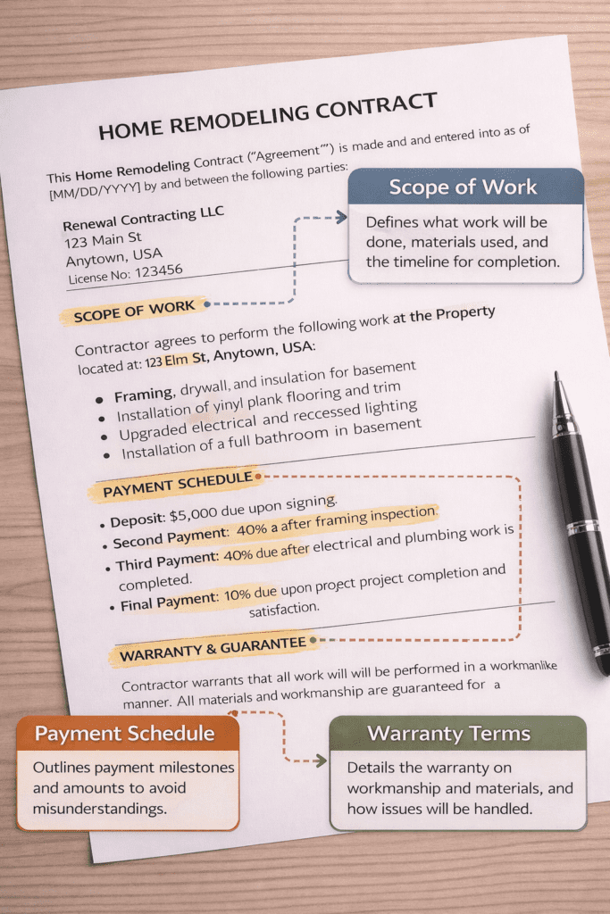• Detailed contracts prevent disputes – Comprehensive agreements should specify materials, timelines, payment schedules, and change order procedures