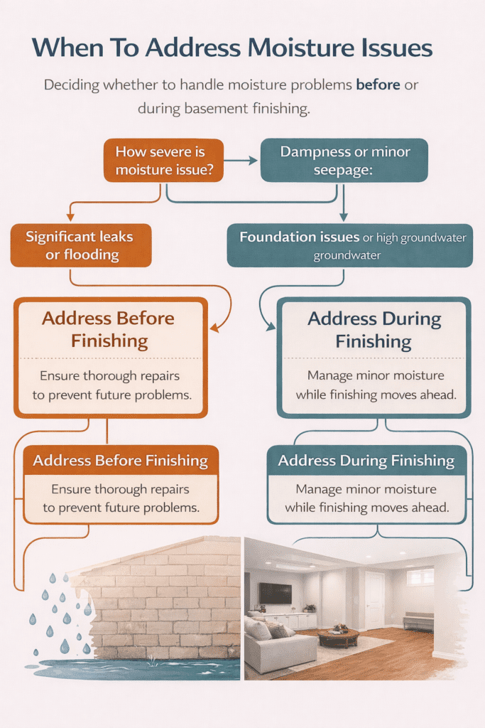 Pre-existing moisture problems significantly impact basement finishing feasibility and costs. Addressing active water intrusion before beginning cosmetic work prevents wasted investment in finishes that water damage will quickly destroy. Some contractors include waterproofing in their basement finishing scope, while others prefer homeowners resolve moisture issues separately before starting finish work.