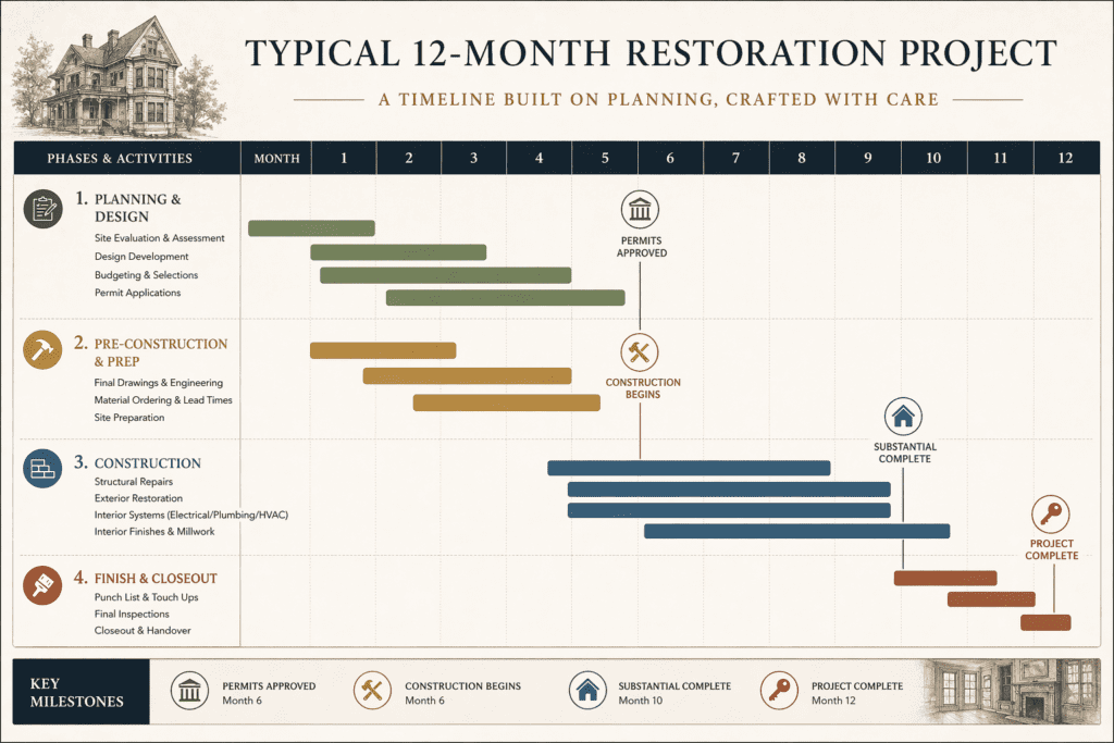 Pre-construction phases consume 2-4 months for assessment, design development, and permitting. Properties in historic districts may require additional time for historic commission reviews and approvals.